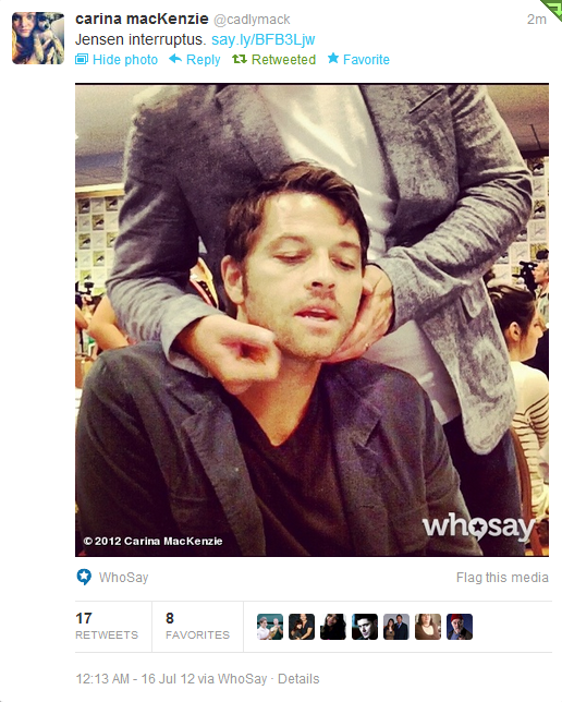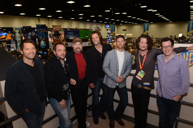 Nice View: The boys of SUPERNATURAL atop the Warner Bros. booth at Comic-Con 2012; from left: stars Misha Collins, Mark A. Sheppard, Jim Beaver, Jared Padalecki and Jensen Ackles, with consulting producer Ben Edlund and executive producer Jeremy Carver (© WBEI. All Rights Reserved.)