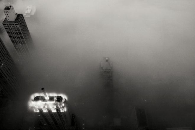 I got on the top floor of the John Hancock Observatory and there was fog sweeping the city. I looked all around at the vast, open city. When I looked down, the lights of this building cast itself through the fog, and it completely amazed me. by Noah Siano